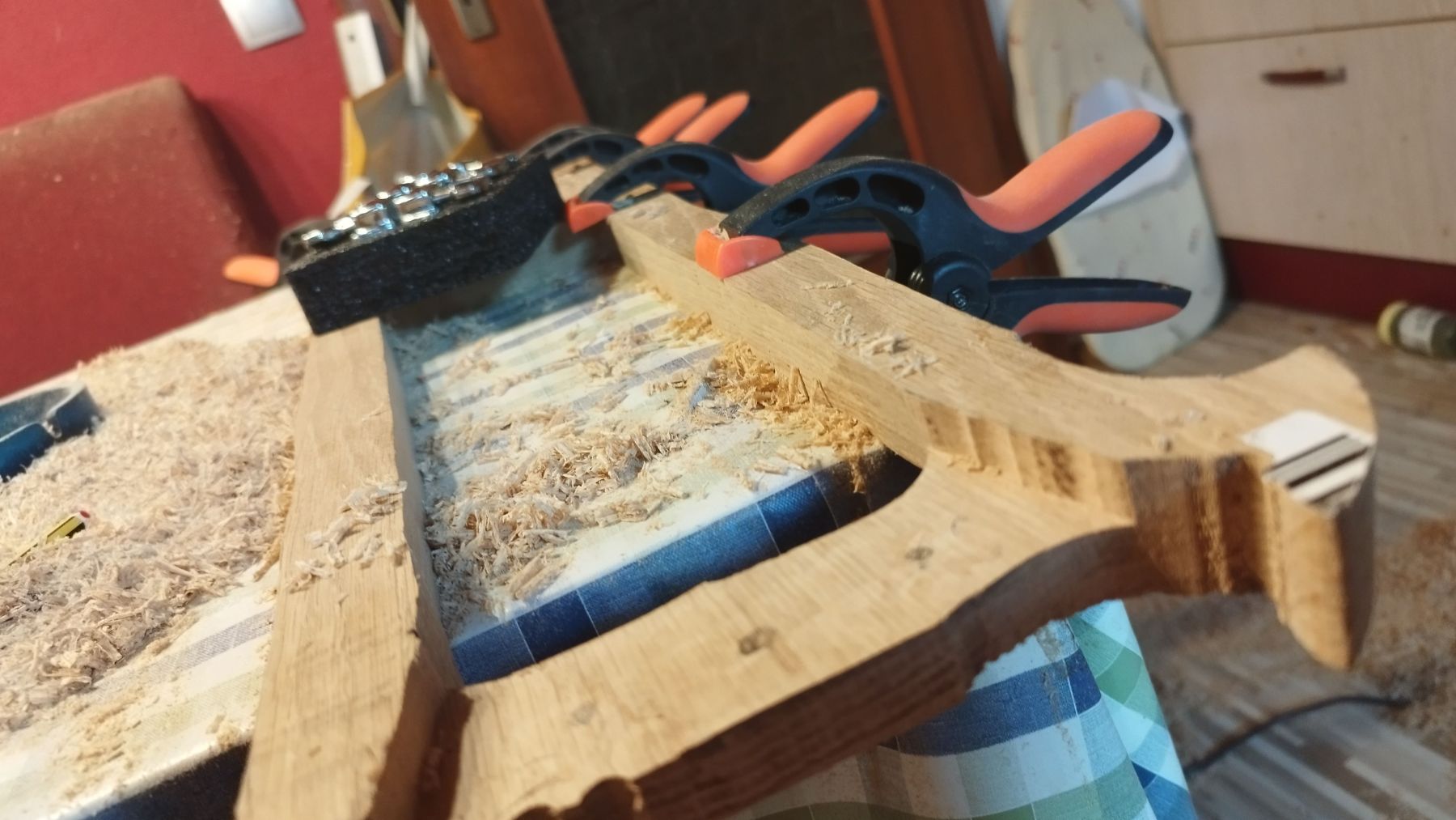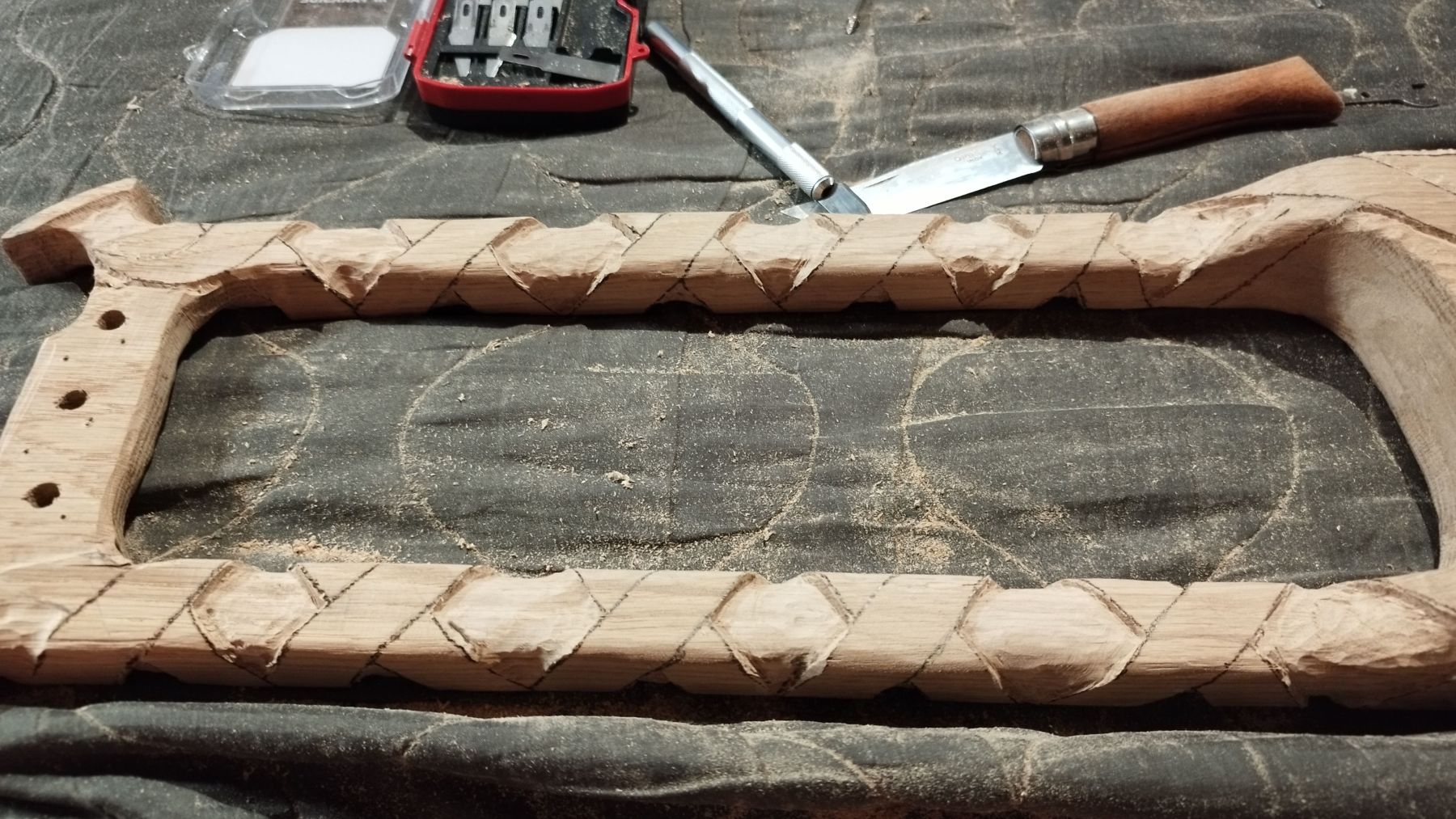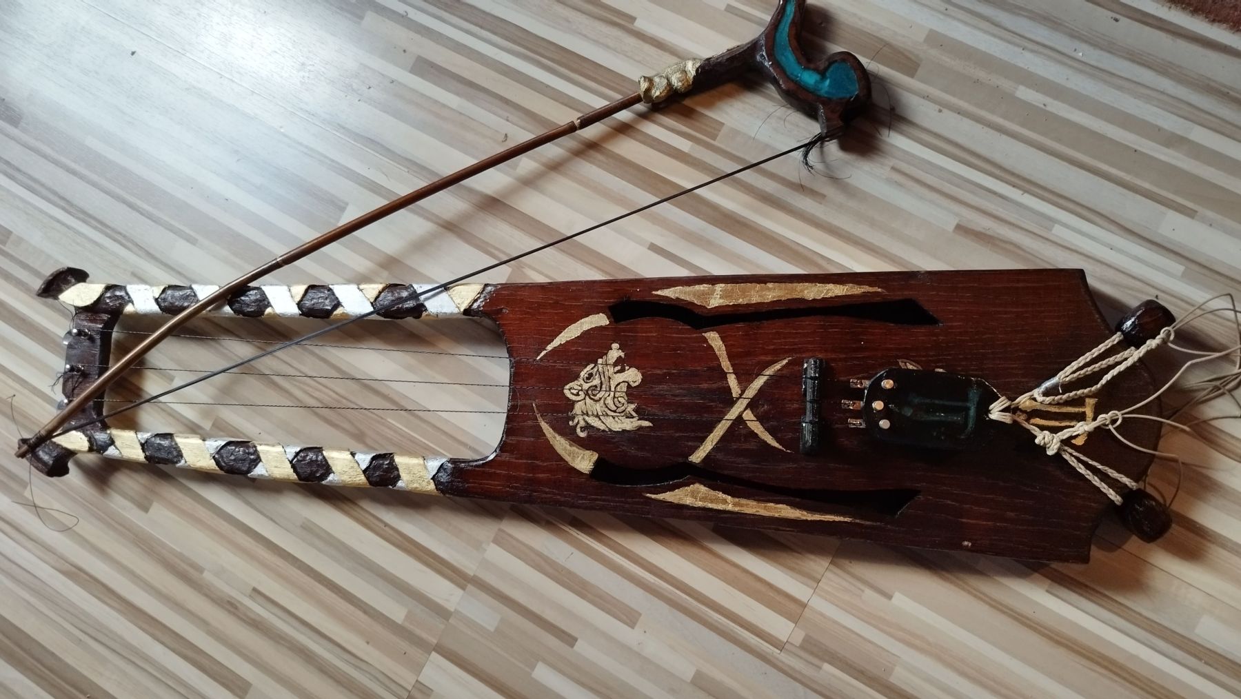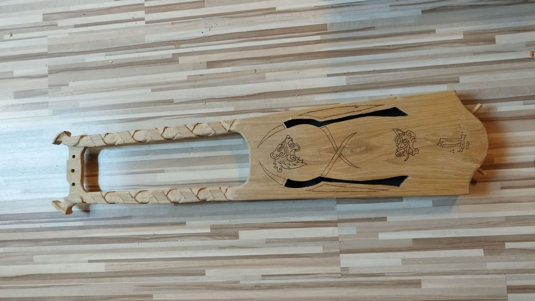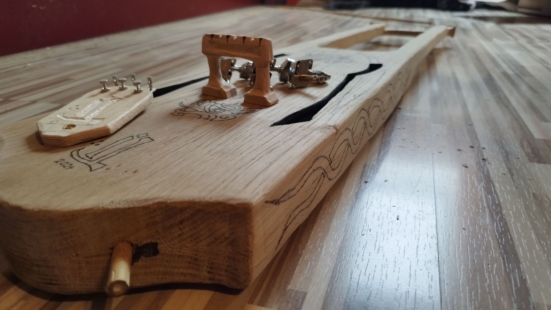The Talharpa shown here produces relatively deep tones with a distinctive, earthy character – the body is made of solid oak. No lamellae, but carved out from solid wood. The hardness of the wood creates a very unique resonance – which is why I also crafted a lyre from the same material. But I will present that one separately!
